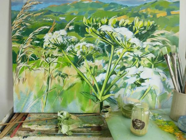 I love painting outdoors in ink and watercolour, often drawing natural forms like hogweed and teasels using dip pens, reeds, brushes, or anything that can hold a point. These calligraphic marks, combined with flowing washes, aim to capture the feeling of being in the open air.